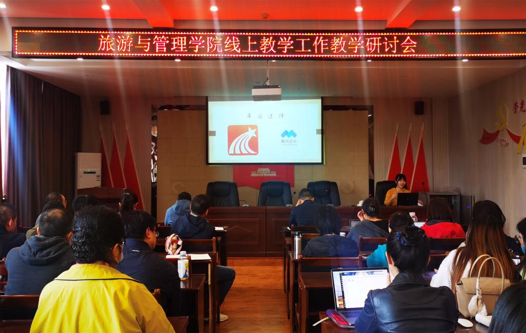 为进一步加强线上教学管理,提升我院教师在线教学技能和育人水平,10月12日,旅游与管理学院召开线上教学工作教学研讨会。副院长肖昆安排部署线上教学工作,全体教师参加会议。