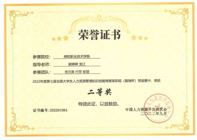 近日,第七届“踏瑞杯”全国大学生人力资源管理知识技能大赛落下帷幕。由旅游与管理学院人力资源管理专业谢婷婷、龙江担任指导教师,吉兰英、彭丽、付芳3名学生组成的代表队荣获第三赛区二等奖。