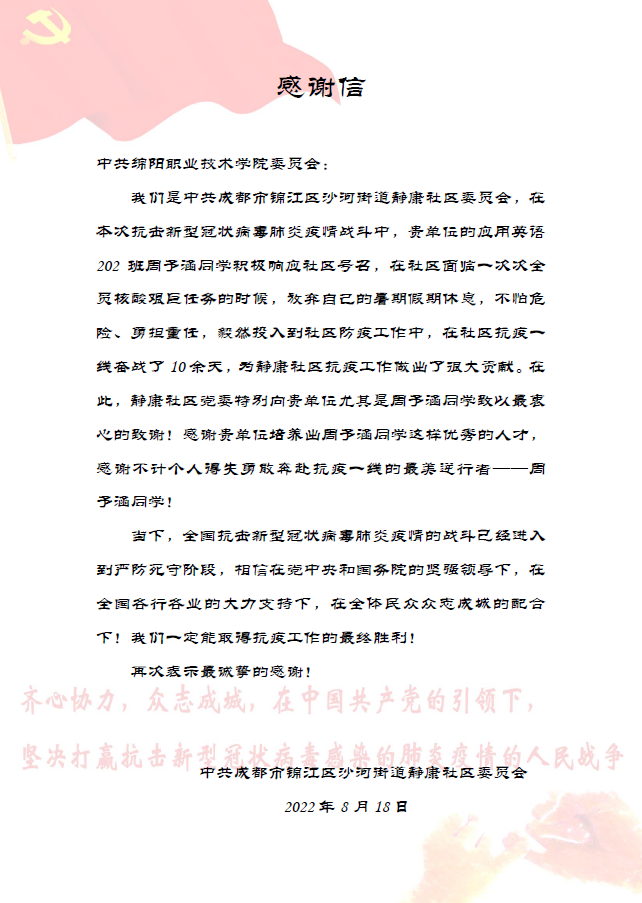 近日,成都市沙河街道静康社区党委向学校寄来感谢信,信中赞扬旅游与管理学院应用英语202班学生周予涵,在四川成都“7.20”和“8.25”两场疫情防控阻击战中,积极投身志愿服务工作,彰显了新时代大学生的责任与担当,对我校人才培养和思政教育的成效表示肯定。
