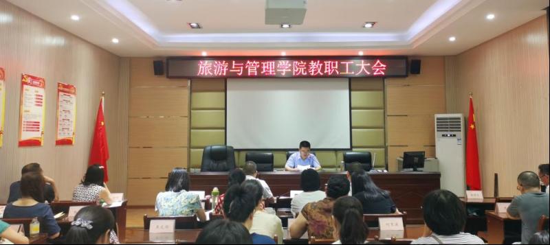 7月19日,旅游与管理学院举行教职工大会,党总支书记苟安经、副院长肖昆、党总支副书记杜鹏、副院长田德刚出席会议。全院教职工参会。