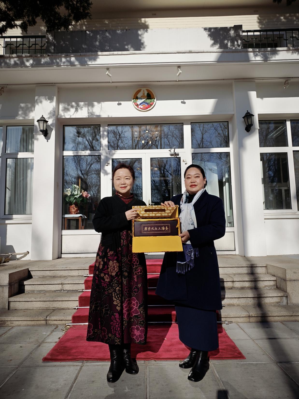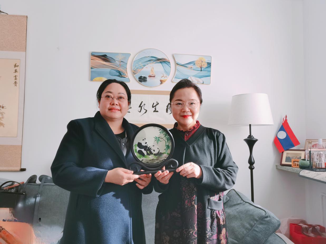 招待会期间,何琴英老师与老挝驻中国大使馆教育文化参赞苏提达博士进行友好交流,并向大使馆赠送了融合绵阳李白文化、四川熊猫元素的蜀绣与书法作品,以特色文化载体传递中老情谊。老挝驻中国大使馆大使宋赛及夫人还与何琴英老师亲切合影。何琴英老师表示,此次参会倍感荣幸与鼓舞,未来将立足本职岗位,发挥专业专长,积极传承中华优秀传统文化,用心讲好中国故事、传播中国声音,为中外交流合作添砖加瓦。