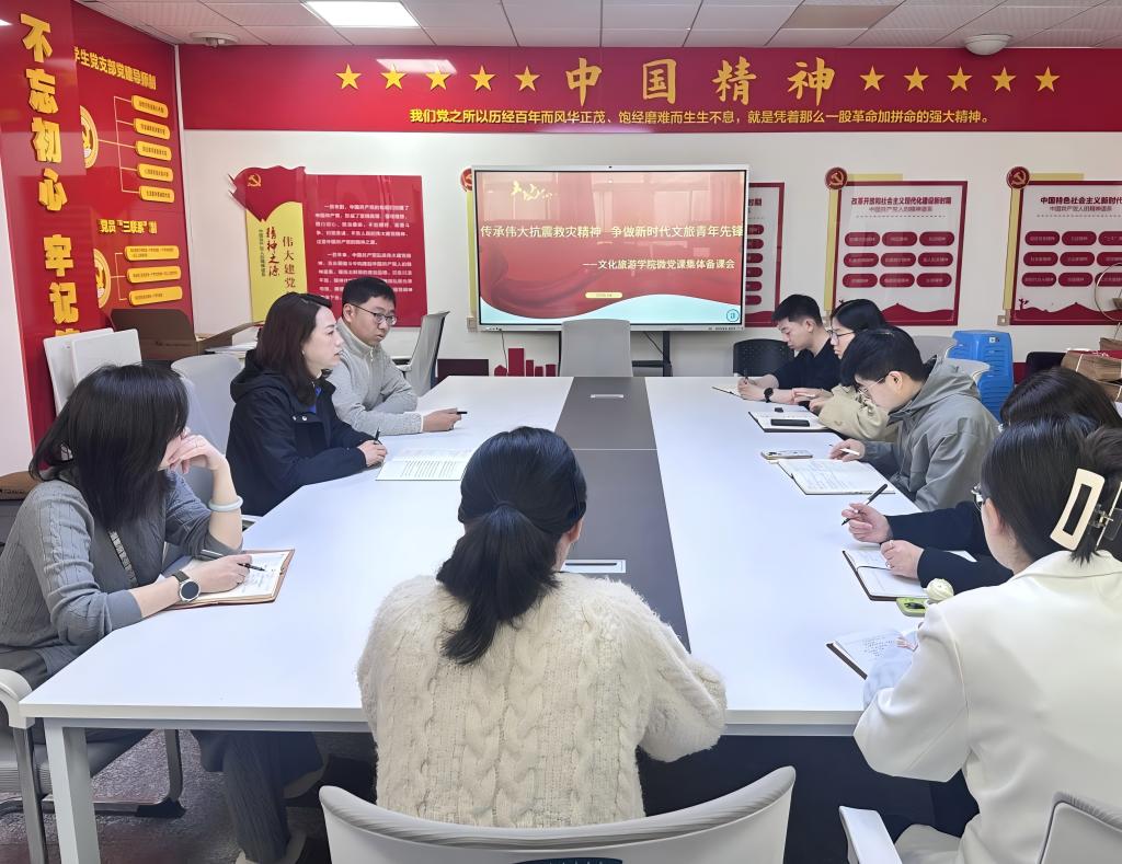 会上,周蒨书记强调,微党课是传递党的声音、筑牢青年信仰、凝聚支部力量的重要载体。本次集体备课旨在统一宣讲口径、丰富宣讲形式,推动红色精神入脑入心,切实发挥党建引领思政育人的核心作用。会议围绕抗震救灾精神宣讲主线,明确备课重点与发力方向,要求全体参会人员立足文旅专业特色,推动红色精神与专业学习、实践服务深度融合,让微党课既有理论高度,更有实践温度。